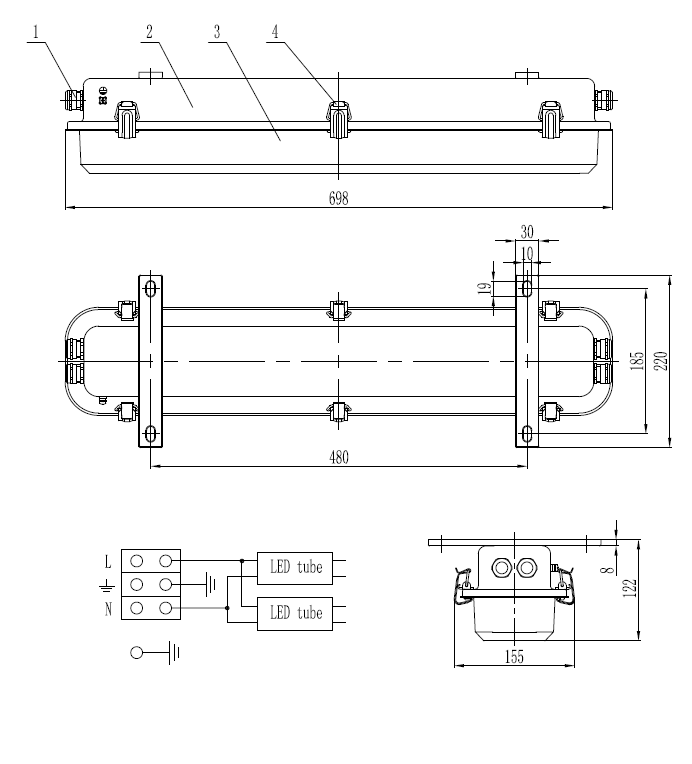 Applied to illumination of water dripping, water spattering, water coagulating places in ships, such as oven cabins, dry cabins, tunnels, pipelines, weather decks, etc.